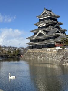 (この前日が雪だったためお城の屋根瓦部分が溶けきっていない雪で薄らと白くなっています)